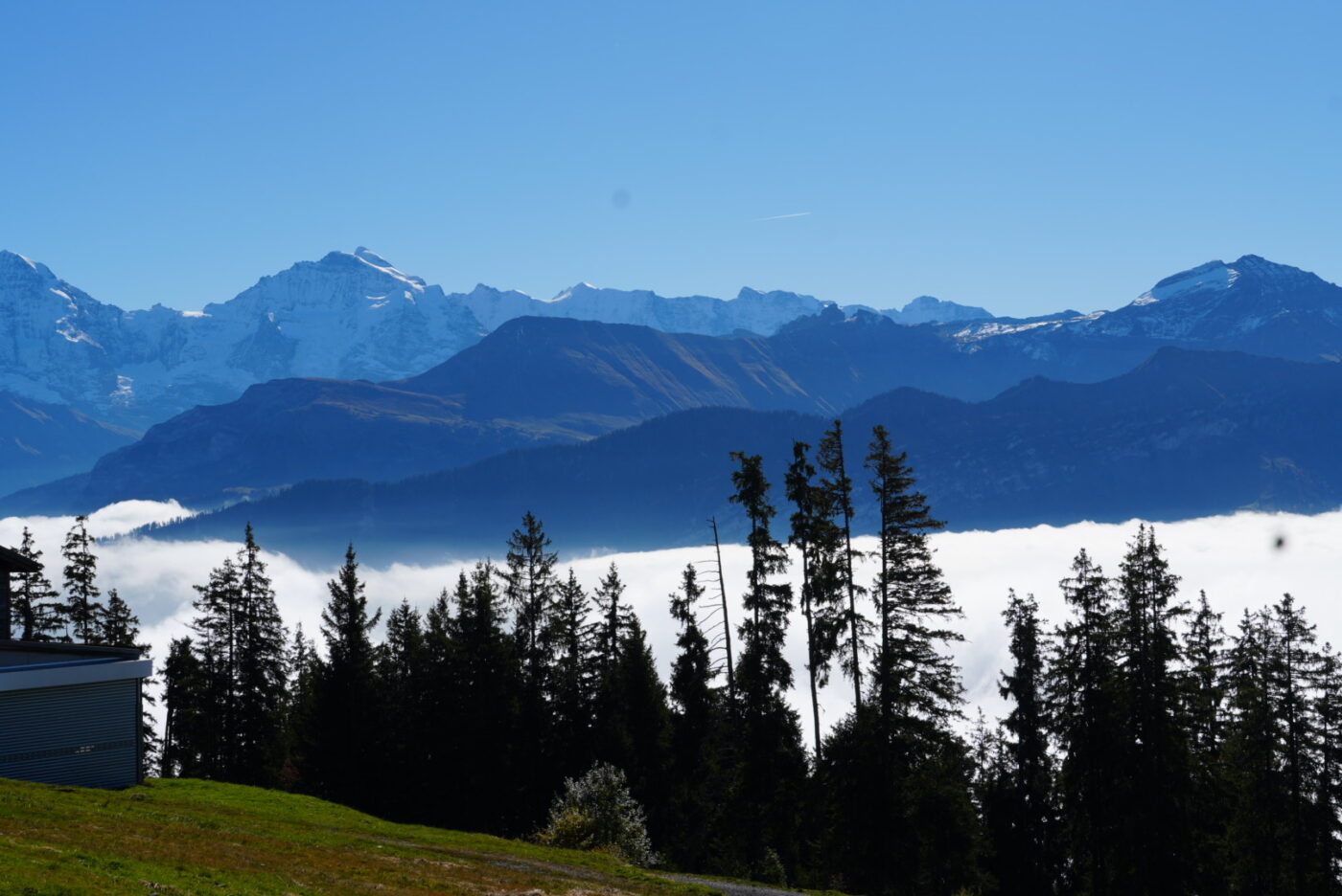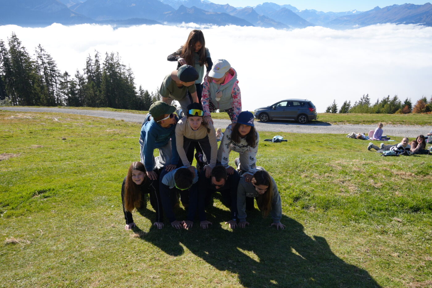 Wir gingen mit dem Postauto zur Haltestelle «Beatenberg, Station». Von dort aus sind wir zuerst durch den Nebel den Berg hinauf gewandert. Dabei haben wir Musik gehört. In der Mittelstation haben wir unsere Mittagspause gemacht. Vom Mittagsplatz her, haben wir die schönen Berge und das Wolkenmeer gesehen. Wir haben auf einer grossen Wiese unseren Lunch gegessen und viele Fotos mit der Kamera gemacht. Einige erledigten auch noch ihre Wochenaufgabe. Nach dem Mittagessen liefen wir wieder nach unten Richtung Lagerhaus. Dabei haben wir ein nacktes, frischgeborenes Mäuschen gesehen (Igitt! Bäääh!). Wir liefen viele Treppen – es war ganz steil. Viele spührten ihren Rücken, wegen dem Fotoshooting.