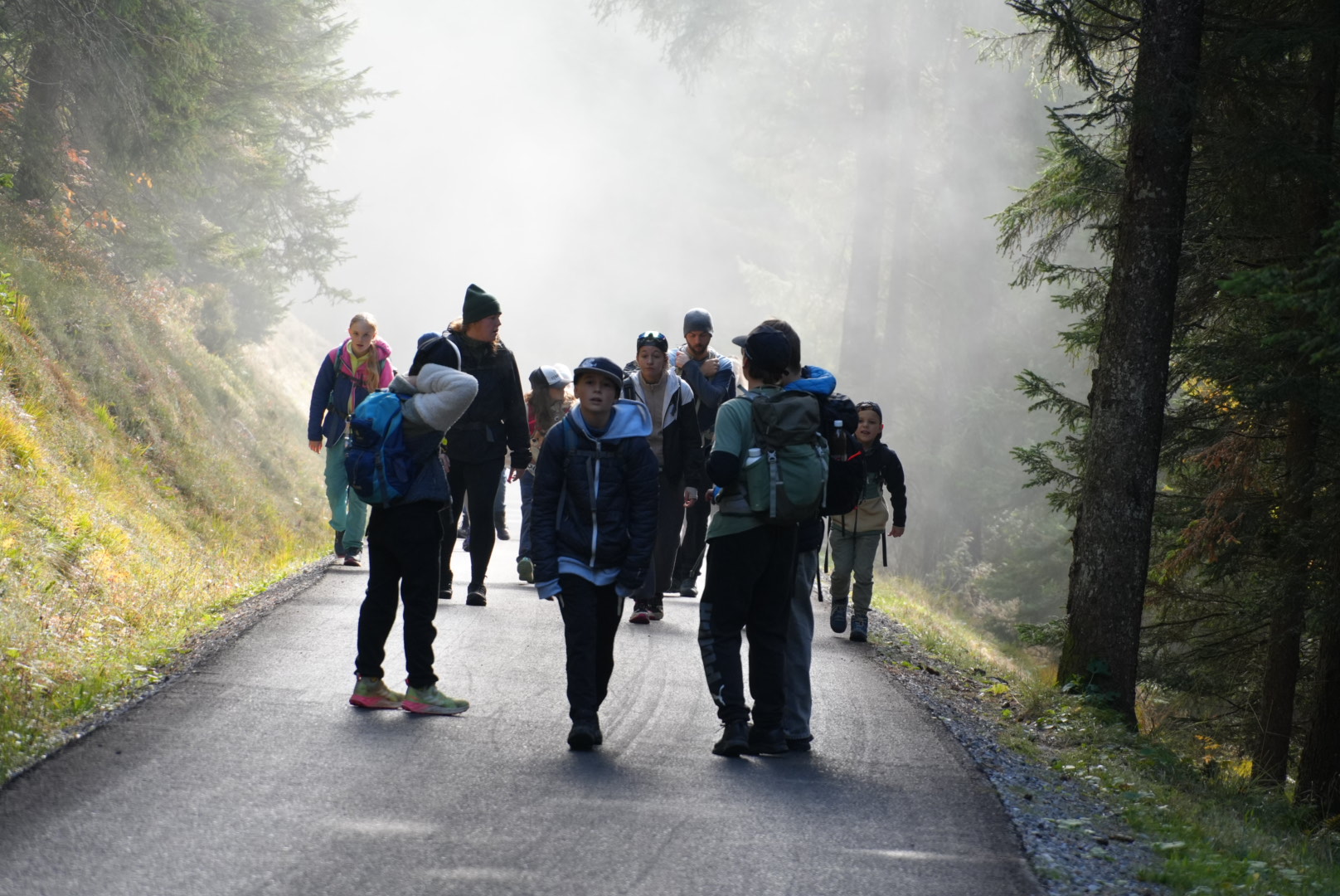 Wir gingen mit dem Postauto zur Haltestelle «Beatenberg, Station». Von dort aus sind wir zuerst durch den Nebel den Berg hinauf gewandert. Dabei haben wir Musik gehört. In der Mittelstation haben wir unsere Mittagspause gemacht. Vom Mittagsplatz her, haben wir die schönen Berge und das Wolkenmeer gesehen. Wir haben auf einer grossen Wiese unseren Lunch gegessen und viele Fotos mit der Kamera gemacht. Einige erledigten auch noch ihre Wochenaufgabe. Nach dem Mittagessen liefen wir wieder nach unten Richtung Lagerhaus. Dabei haben wir ein nacktes, frischgeborenes Mäuschen gesehen (Igitt! Bäääh!). Wir liefen viele Treppen – es war ganz steil. Viele spührten ihren Rücken, wegen dem Fotoshooting.