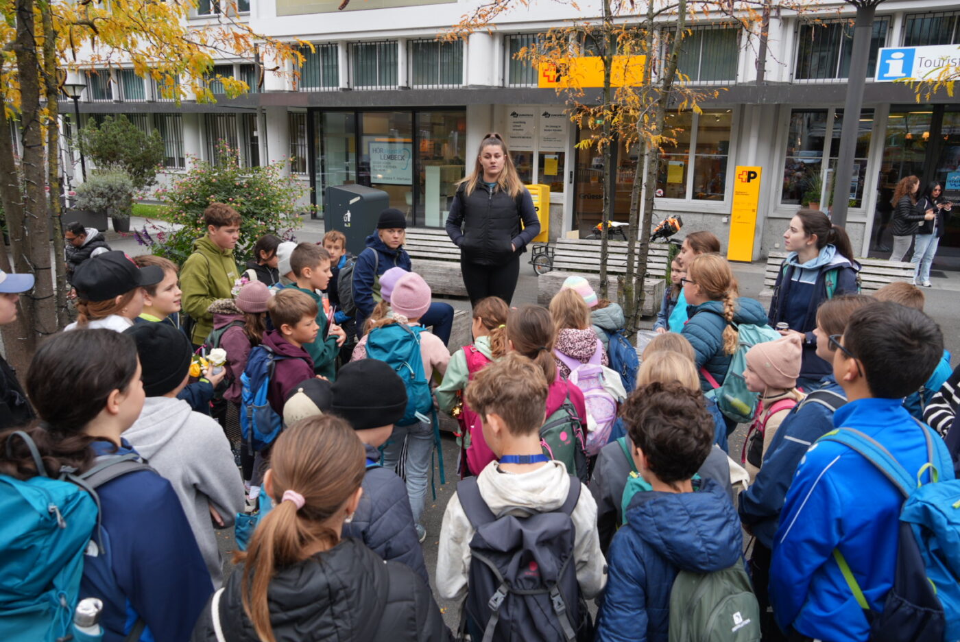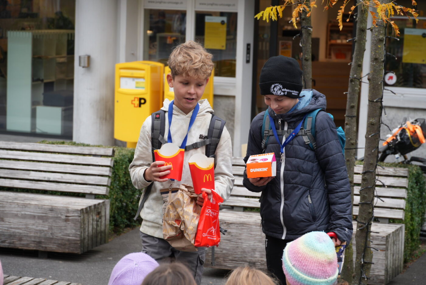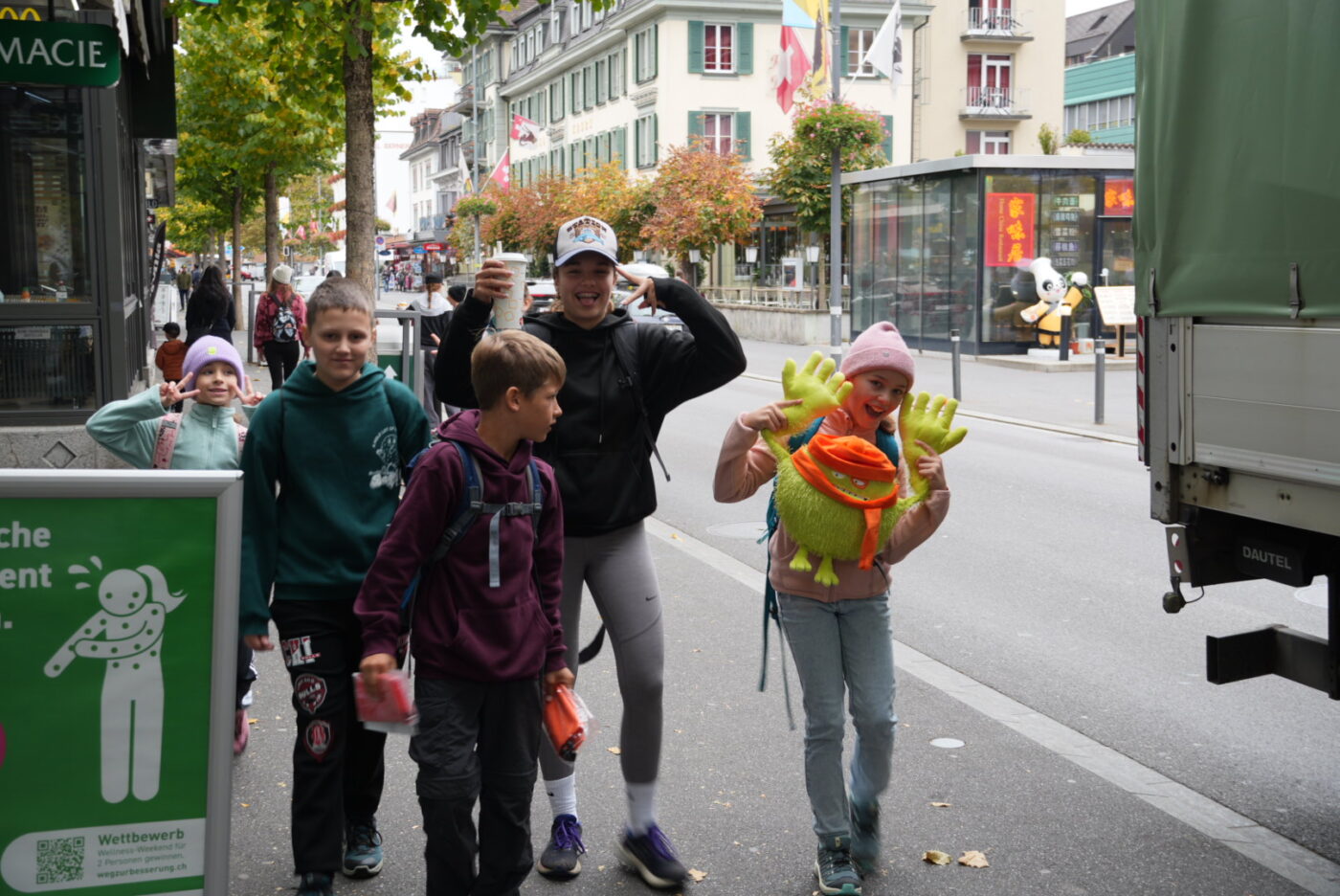 Wir wurden in sechs Sechsergruppen eingeteilt. In diesen haben wir ein Tauschspiel durchgeführt. Jede Gruppe bekam ein Ei oder eine Banane. Diese mussten in einen Alltagsgegenstand getauscht werden. Zusätzlich bekam jede Gruppe ein Sugus, welches in ein typisch schweizerisches Souvenir getauscht werden musste. Jede Gruppe bekam im Läderach gratis Schokolade ohne einen Tausch. Am Schluss war jede Gruppe erfolgreich. Am Mittag liefen wir zwanzig Minuten Richtung Seilpark. Dort bekamen wir vom Küchenteam Sandwiches.